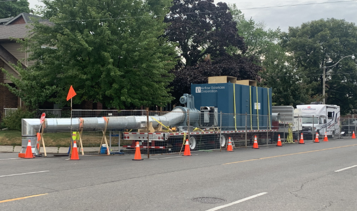 To avoid noise complaints in suburban or urban areas during testing, noise control barriers are placed around the fan and extraction ductwork. To eliminate odors, the air drawn from the sewer is treated with a carbon scrubber. Results from a comprehensive test for a major North American municipality are detailed in our Fall 2013 newsletter article "Fan Test" Helps Design Odor Control Facility.